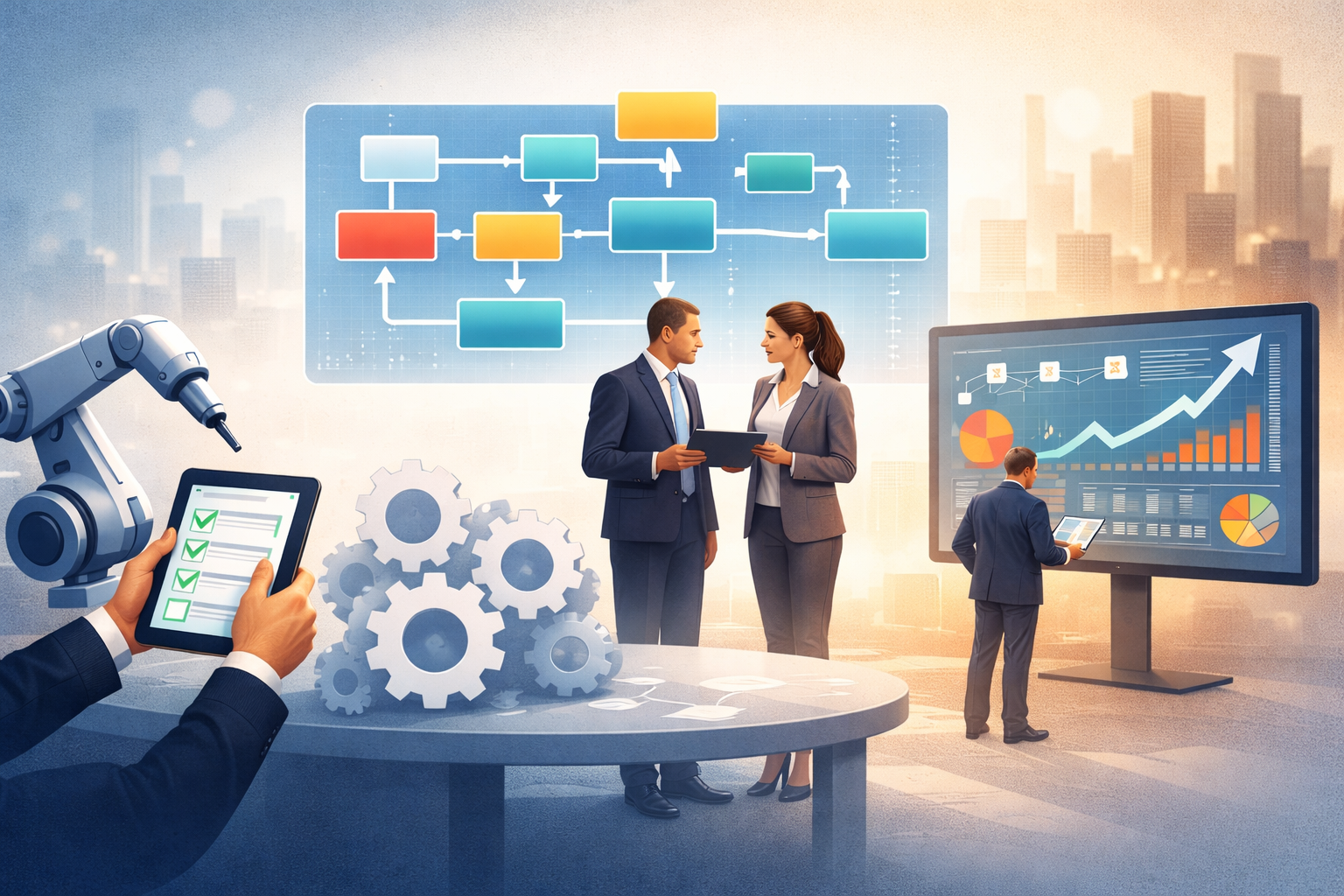 A melhoria de processos internos — como fluxos de aprovação, comunicação entre equipes e organização de tarefas — costuma gerar ganhos rápidos de produtividade, reduzindo horas improdutivas e custos indiretos.